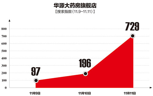 而“双十一”当天搜索指数较前一天增长较大的前三名分别为:华源大药房旗舰店、壹号大药房旗舰店、七乐康大药房旗舰店。