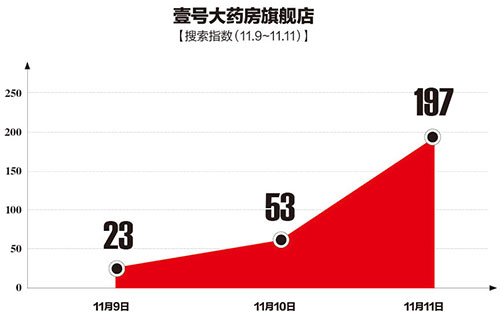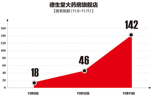 德生堂大药房。结合其近一个月(2014-10-13 至 2014-11-11)访问人群偏好,对“血糖用品”这个品种的关注度高达“86.94%”。不过,德生堂大药房董事龙岩12日早上透露,此次“双十一”全网销售目标为1000万元,而实际斩获967万元,与目标略有差距。