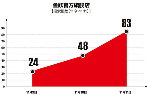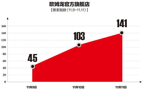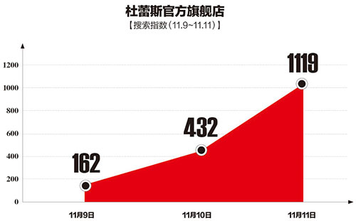 我们发现,在“双十一”当天,搜索指数名列前三的分别为:七乐康大药房旗舰店、康爱多大药房旗舰店、杜蕾斯**旗舰店。