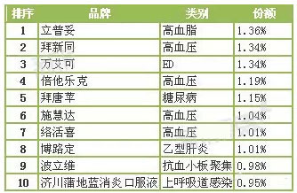 从类别来看,RX产品中慢性病用药表现抢眼,在TOP5品牌中,三高产品占四席,而在TOP20品牌中,高血压产品占六席,糖尿病产品占三席,高血脂、心血管和脑血管产品各占一席。除了慢性病用药以外,乙型肝炎的两大产品博路定和贺普丁也进入了畅销品牌TOP20之列。