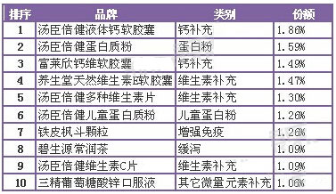从具体产品来看,汤臣倍健的液体钙软胶囊和蛋白质粉分别以1.86%及1.59%的市场份额抢占了畅销品牌前二席位,富莱欣钙维软胶囊排名第三,市场份额为1.49%。
