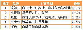 零售药店医疗器械市场的集中度较高,仍以血压计、血糖仪和试纸等常用的家用医疗器械以及避孕套等计生用品为主。