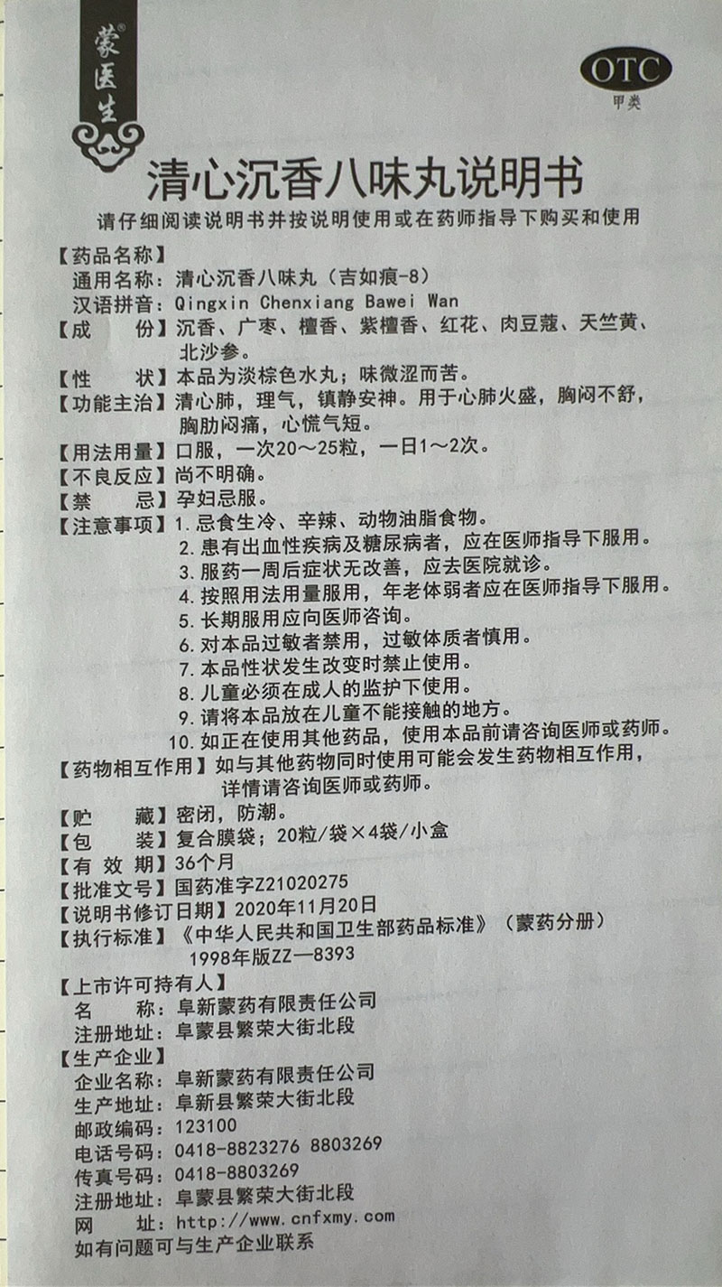 产品名称:蒙医生清心沉香八味丸