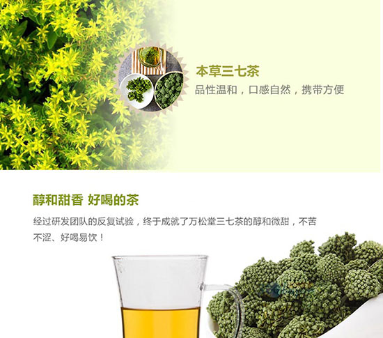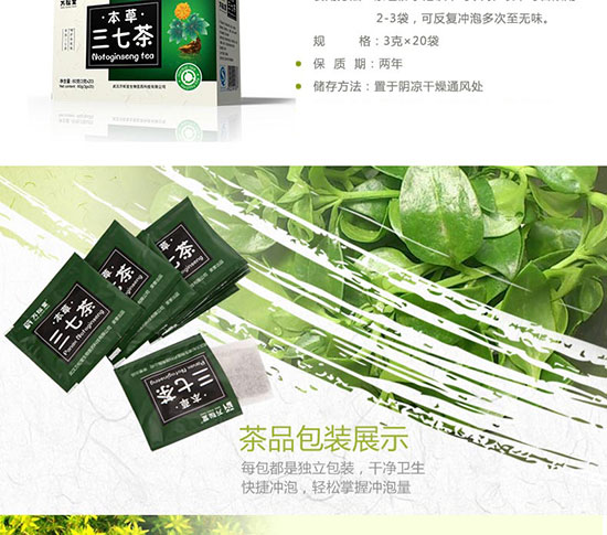 本产品依据传统中医理论采用神农架药食同源的三七提取物、甜茶等天然植物精制而成,它品性温和,口感自然,携带方便, 是益寿养生的健康饮品。珍品三七 益寿养生 植物精华 草本天然