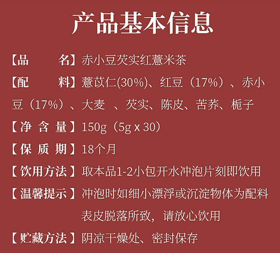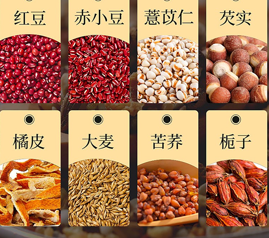 配料:薏苡仁(30%)、红豆(17%)、赤小豆(17%)、大麦、芡实、陈皮、苦荞、栀子