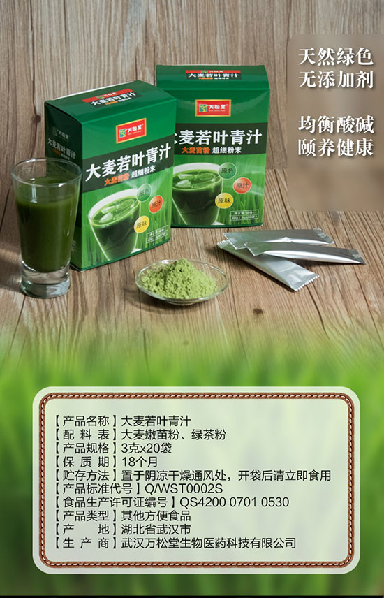 本网页所展示的有关【青汁大麦若叶青汁强碱瘦身粉减肥清肠正品排毒万松堂青汁茶_茶饮_武汉万松堂生物医药有限公司】的加盟项目信息/图片/参数等由1168医药保健品招商网的会员【武汉万松堂生物医药有限公司】提供,由1168医药保健品招商网会员【武汉万松堂生物医药有限公司】自行对加盟信息/图片/参数等的真实性、准确性和合法性负责,本平台(本网站)仅提供展示服务,请谨慎交易,因交易而产生的法律关系及法律纠纷由您自行协商解决,本平台(本网站)对此不承担任何责任。您在本网页可以浏览【青汁大麦若叶青汁强碱瘦身粉减肥清肠正品排毒万松堂青汁茶_茶饮_武汉万松堂生物医药有限公司】有关的加盟信息/图片/价格等及提供【青汁大麦若叶青汁强碱瘦身粉减肥清肠正品排毒万松堂青汁茶_茶饮_武汉万松堂生物医药有限公司】的商家公司简介、联系方式等信息。