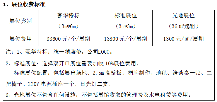 1、展位收费标准