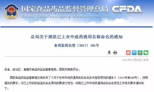 近日,39医药君从国家食品药品监督管理总局获悉,该局印发《中成药通用名称命名技术指导原则》,同时下发《关于规范已上市中成药通用名称命名的通知》。《原则》发布后受理的中药新药应根据此技术指导原则的要求进行命名,而对已上市的药品违反命名原则的要进行规范,也就是说,有不少中成药或将面临强制改名的命运。