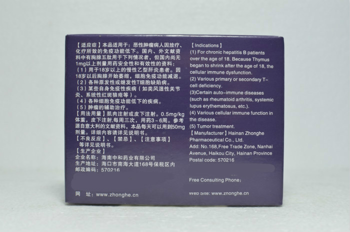 发表资料显示胸腺五肽是免疫双向调节用药,具有诱导和促进T淋巴细胞及其亚群分化、成熟和活化的作用,可以调节和增强人体细胞免疫功能;能促使有丝分裂原激活后的外周血中的T淋巴细胞成熟,增加T细胞在各种抗原或致有丝分裂原激活后各种淋巴因子的分泌,增加T细胞上淋巴因子受体的水平。产品说明书内容显示适用于:恶性肿瘤病人因放疗、化疗所致的免疫功能低下。1.用于18岁以上的慢性乙型肝炎患者。2.各种原发性或继发性T细胞缺陷病(如儿童先天性免疫缺陷病)。3.某些自身免疫性疾病(如类风湿性关节炎、系统性红斑狼疮等)。4.各种细胞免疫功能低下的疾病。5.肿瘤的辅助治疗。