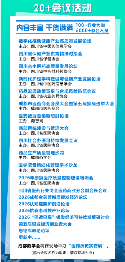博览会期间,将举办超过20场高水平的专题交流会议活动,包括“数字化推动健康产业高质量发展论坛”、“新时代护理学科建设与健康产业发展论坛”、“四川省保健产业供需精准对接会”、“医药数据营销新动能论坛”、“四川省中医药高质量发展论坛”、“药品流通政策宣贯与合规风险防范会议”、“药品生产质量管理沙龙”、“成都市医药商会会员大会”“医学装备精细化管理沙龙”、“四川社会办医可持续发展会议”等。